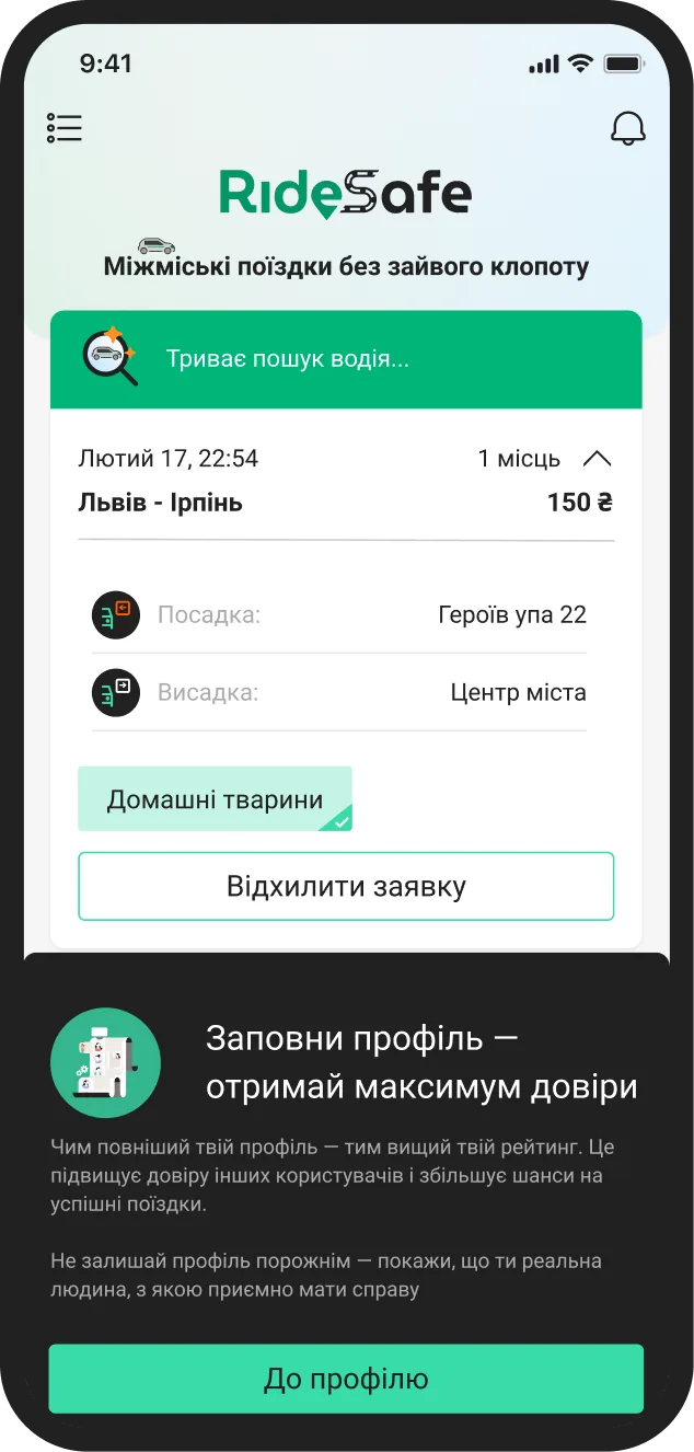 Якщо водій не відповідає в межах дедлайну, ваш запит автоматично закінчується. Без ігнору та нескінченного очікування — одразу можете подати заявку на інші поїздки.